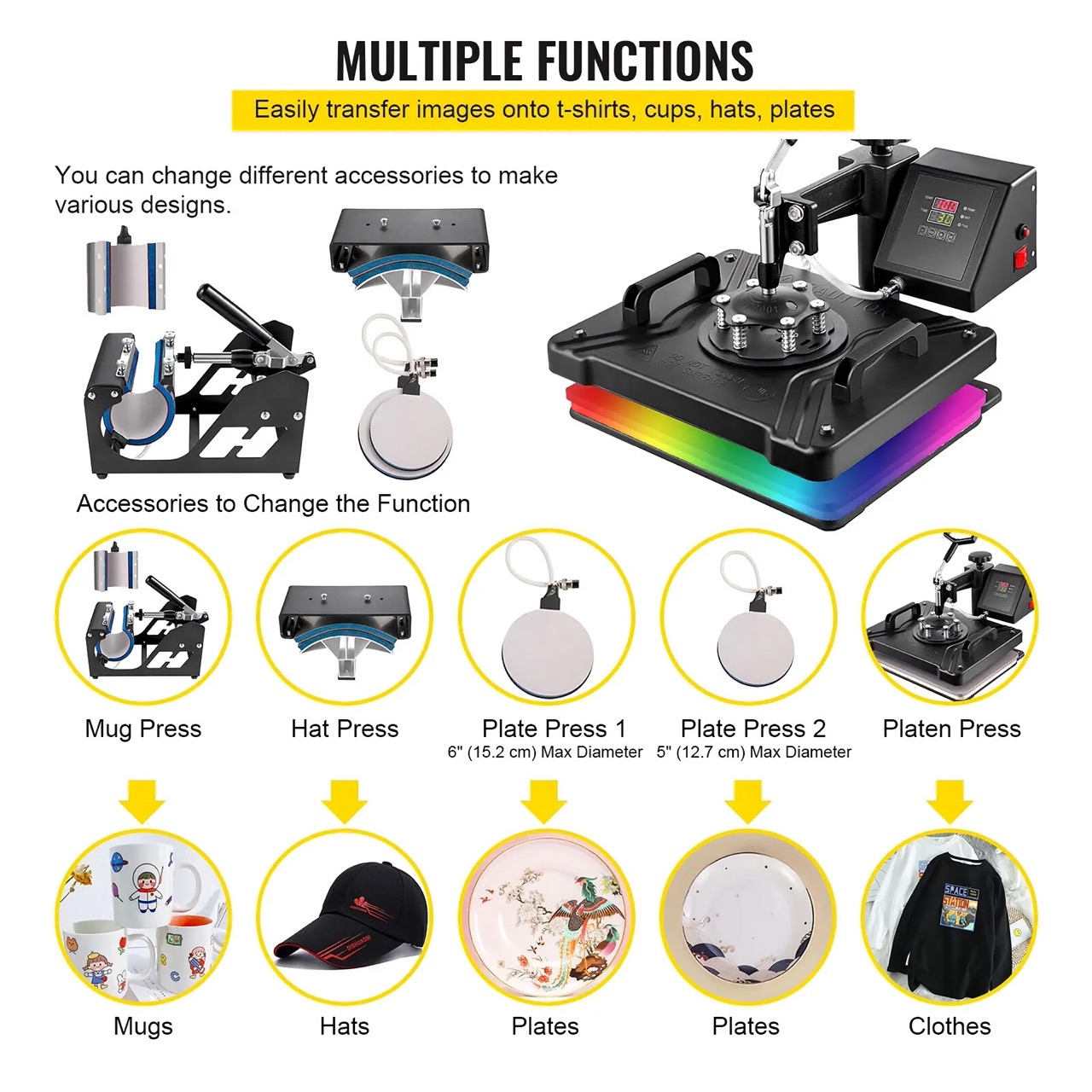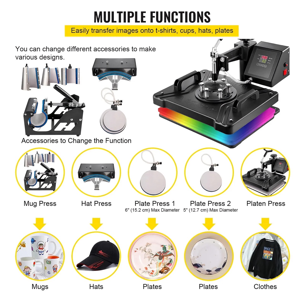 Introducing our versatile Combo Heat Press Machine, the pinnacle of printing technology that lets you express your creativity on various surfaces effortlessly. With its innovative design and cutting-edge features, this machine empowers you to bring your designs to life on T-shirts, hats, plates, mugs, and more.